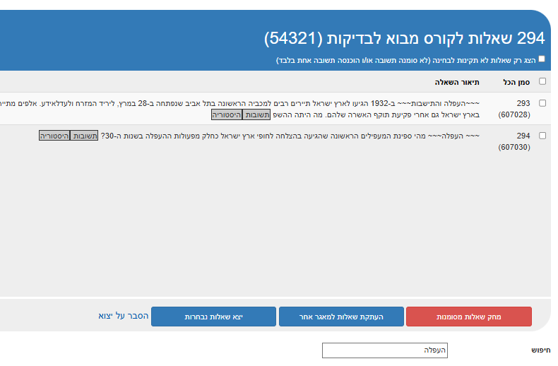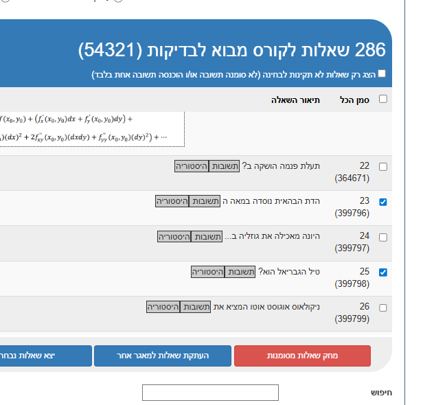 ניתן כעת למחוק מהמאגר מספר רב של שאלות (מדובר כמובן במחיקה לוגית, במידה והשאלה הופיע בבחינה היא לא נמחקת מהבחינה). כדי לעשות זאת